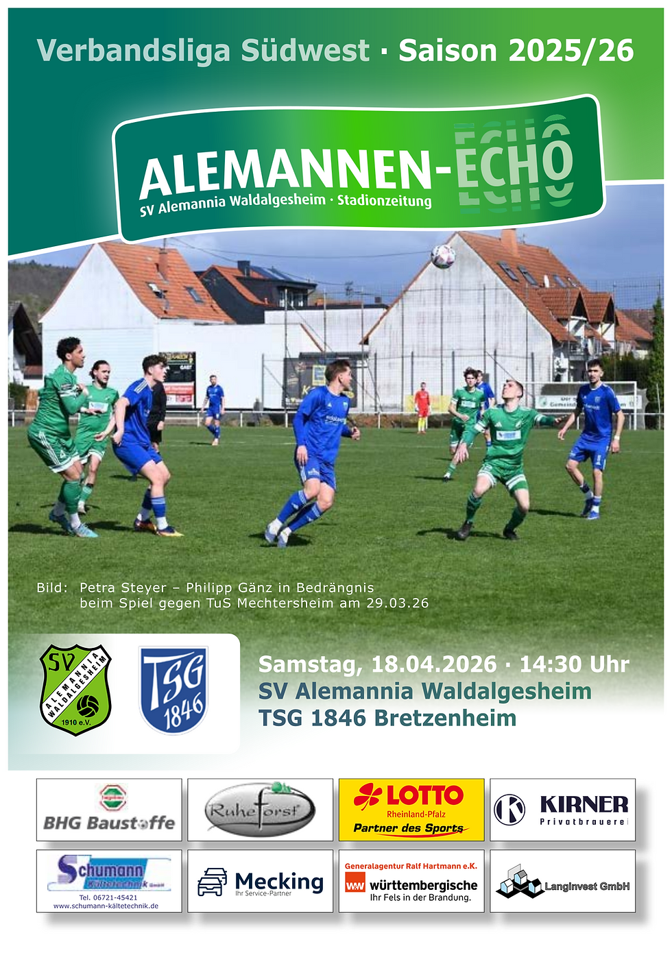 Zum heutigen Spiel in der Verbandsliga Südwest heißen wir Euch in unserer schönen Langinvest Arena herzlichst willkommen. Dieser Gruß gilt insbesondere unseren heutigen Gästen, den Spielern, Funktionären und den Anhängern der TSG Bretzenheim. Besonders begrüßen wir auch die Schiedsrichter des heutigen Spiels. Geleitet wird die Partie von dem Schiedsrichter Julian Haßler, assistieren werden ihm Julian Klimesch und David Joram Denkmann. Wir wünschen ihnen viel Erfolg und eine souveräne Leitung.